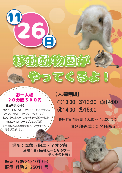 2023年11月26(日) エコール・リラにおいて「移動動物園」を開催!(主催:合同会社はーとせらぴー「チッチのお家」)